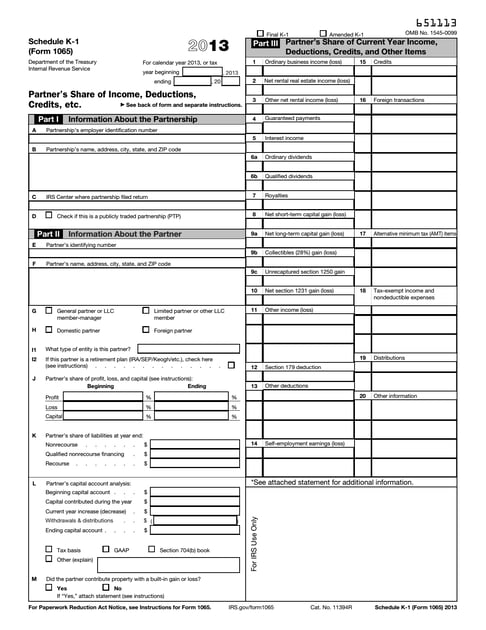 Schedule K-1 is filed to tell you about earnings from a partnership or S corporation. Each partner is responsible for filing an individual tax return reporting their share of income losses tax deductions and tax credits that the business reported on the informational 1065 tax form. But an exception exists if Code B appears in box 13 of your Schedule K-1.
